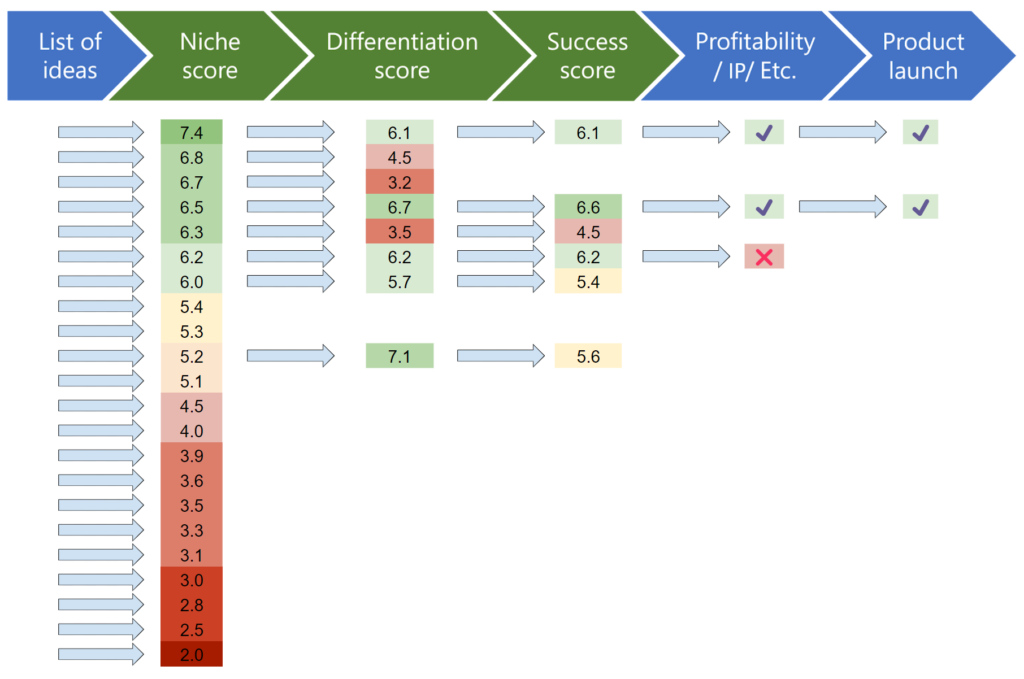 While OptiScale can analyze individual niches or product ideas, we strongly suggest using a product funnel methodology. This strategy lets you evaluate the potential of numerous niches, focus on those with the most promise, assess your differentiation within them, and ultimately launch products that have the highest likelihood of success